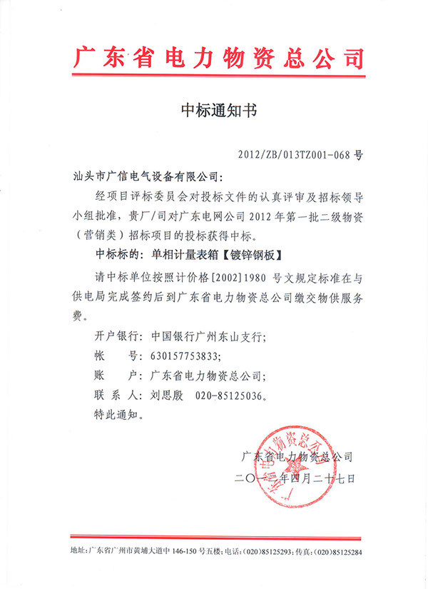 恭贺我司成为“广东电网公司2012年第一批二级物资(营销类)招标项目”的中标单位